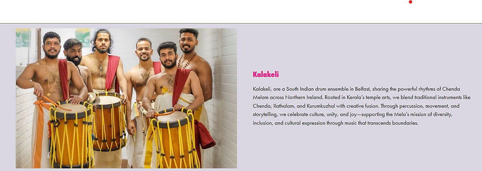 Kalakeli, are a South Indian drum ensemble in Belfast, sharing the powerful rhythms of Chenda Melam across Northern Ireland. Rooted in Kerala’s temple arts, we blend traditional instruments like Chenda, Ilathalam, and Kurumkuzhal with creative fusion. Through percussion, movement, and storytelling, we celebrate culture, unity, and joy—supporting the Mela’s mission of diversity, inclusion, and cultural expression through music that transcends boundaries.